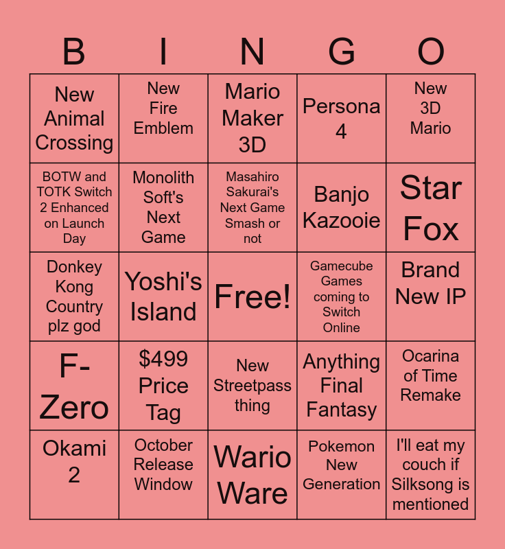 This bingo card has a free space and 24 words: Okami 2, $499 Price Tag, Masahiro Sakurai's Next Game Smash or not, Pokemon New Generation, New 3D Mario, New Animal Crossing, New Fire Emblem, Mario Maker 3D, Gamecube Games coming to Switch Online, Brand New IP, Donkey Kong Country plz god, Monolith Soft's Next Game, Anything Final Fantasy, Ocarina of Time Remake, BOTW and TOTK Switch 2 Enhanced on Launch Day, October Release Window, Wario Ware, Persona 4, Star Fox, F-Zero, Yoshi's Island, New Streetpass thing, Banjo Kazooie and I'll eat my couch if Silksong is mentioned.