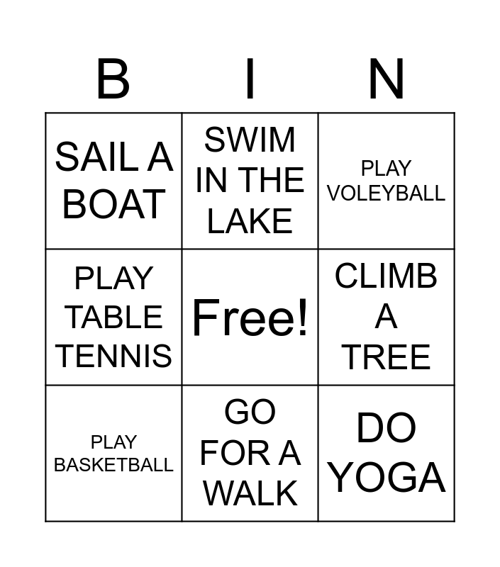 This bingo card has a free space and 8 words: CLIMB A TREE, PLAY VOLEYBALL, SWIM IN THE LAKE, PLAY BASKETBALL, SAIL A BOAT, DO YOGA, PLAY TABLE TENNIS and GO FOR A WALK.