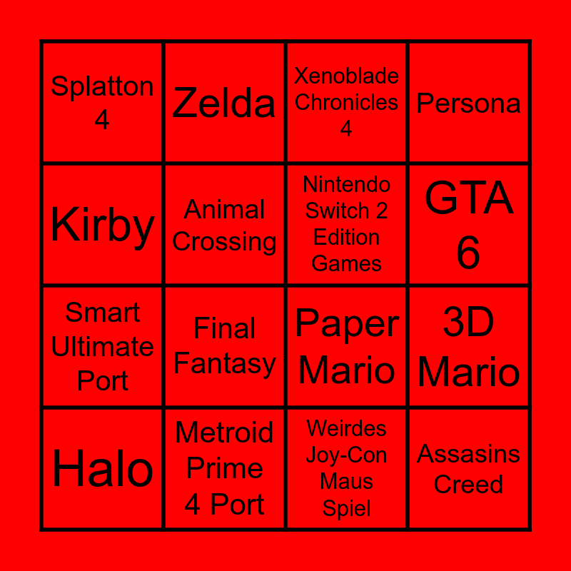 This bingo card has 16 words: Metroid Prime 4 Port, 3D Mario, Xenoblade Chronicles 4, Splatton 4, Smart Ultimate Port, Zelda, Paper Mario, Weirdes Joy-Con Maus Spiel, Kirby, Animal Crossing, Halo, Persona, Final Fantasy, GTA 6, Nintendo Switch 2 Edition Games and Assasins Creed.