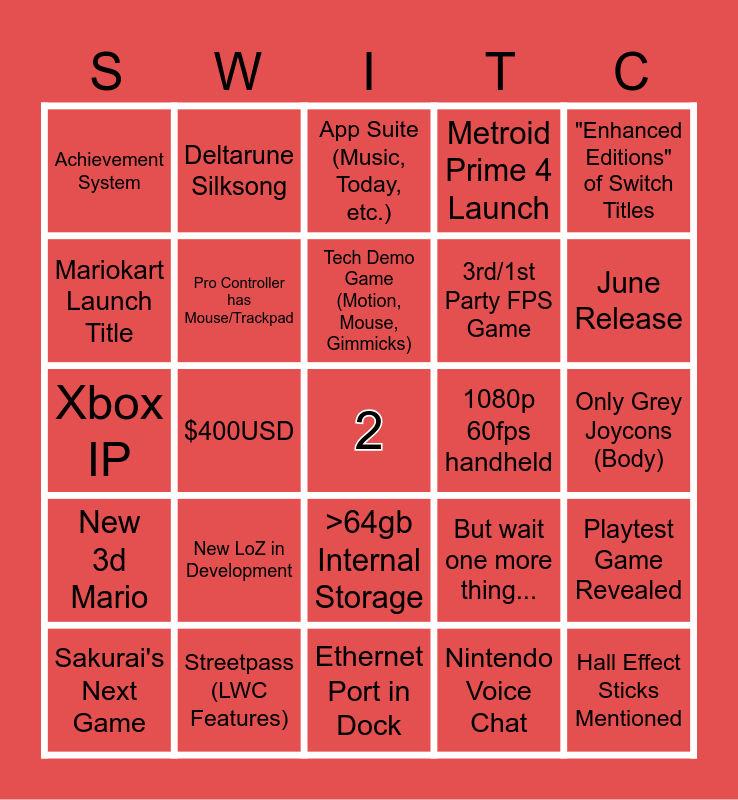 This bingo card has a free space and 30 words: Streetpass (LWC Features), Unique Gimmick (Not Mouse), $400USD, Mii Revival, Achievement System, App Suite (Music, Today, etc.), Pro Controller has Mouse/Trackpad, >64gb Internal Storage, 1080p 60fps handheld, Ethernet Port in Dock, Only Grey Joycons (Body), Hall Effect Sticks Mentioned, Nintendo Voice Chat, Themes (Minimalist), June Release, New IP, But wait one more thing..., New 3d Mario, New LoZ in Development, "Enhanced Editions" of Switch Titles, Xbox IP, Sony IP, Deltarune Silksong, 3rd/1st Party FPS Game, Mariokart Launch Title, Metroid Prime 4 Launch, Playtest Game Revealed, Sakurai's Next Game, Tech Demo Game (Motion, Mouse, Gimmicks) and Revived IP (Skipped on Switch).