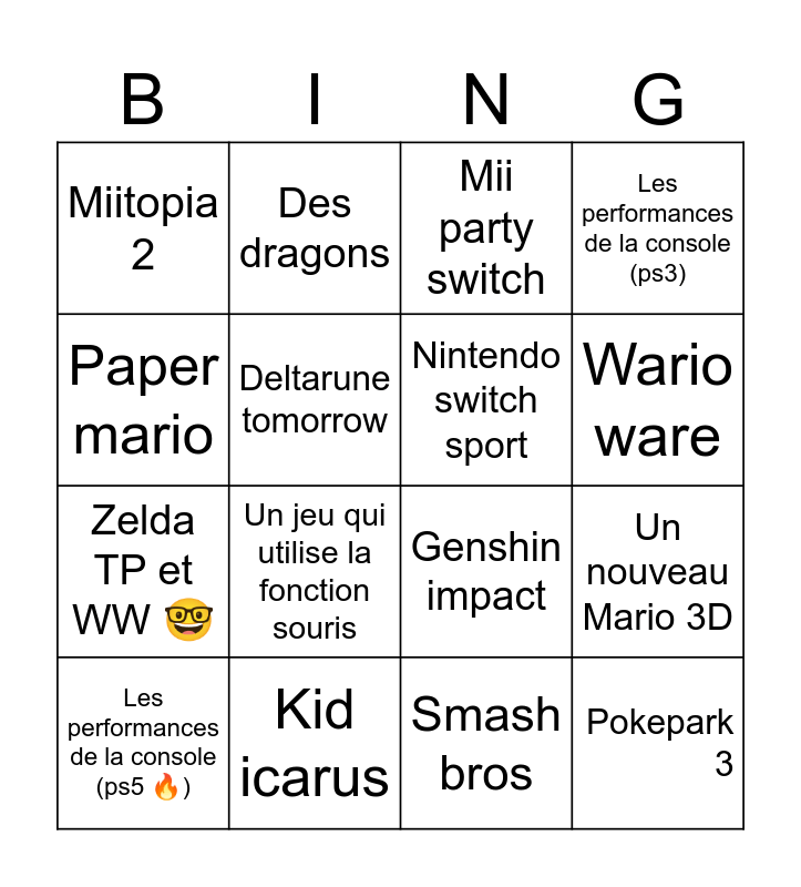 This bingo card has 16 words: Kid icarus, Un nouveau Mario 3D, Mii party switch, Miitopia 2, Zelda TP et WW 🤓, Des dragons, Genshin impact, Smash bros, Paper mario, Deltarune tomorrow, Les performances de la console (ps5 🔥), Les performances de la console (ps3), Un jeu qui utilise la fonction souris, Wario ware, Nintendo switch sport and Pokepark 3.