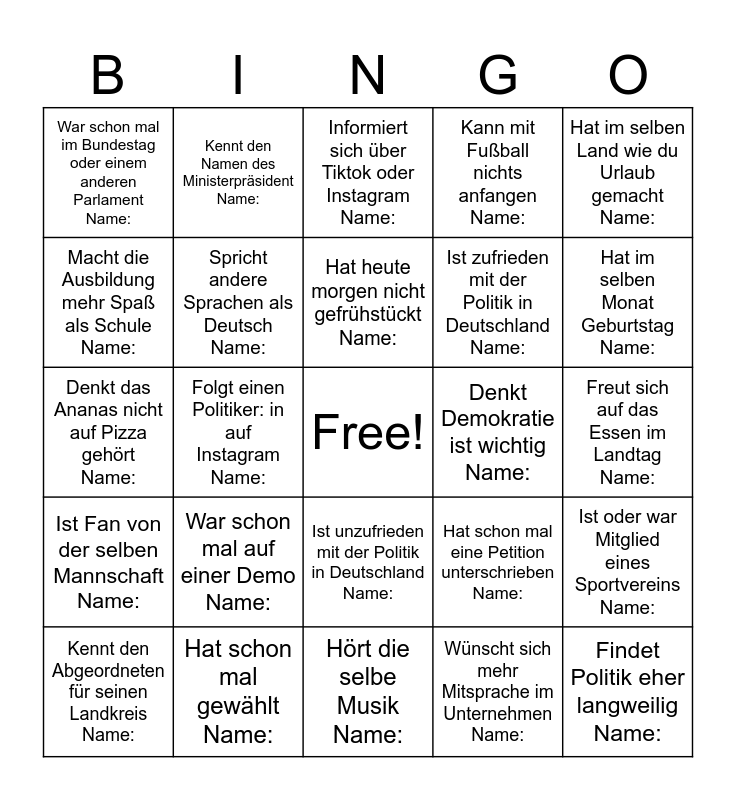 This bingo card has a free space and 24 words: War schon mal auf einer Demo Name:, Hat schon mal gewählt Name:, Hat heute morgen nicht gefrühstückt Name:, Kennt den Abgeordneten für seinen Landkreis Name:, Hat im selben Land wie du Urlaub gemacht Name:, War schon mal im Bundestag oder einem anderen Parlament Name:, Macht die Ausbildung mehr Spaß als Schule Name:, Kennt den Namen des Ministerpräsident Name:, Denkt Demokratie ist wichtig Name:, Ist unzufrieden mit der Politik in Deutschland Name:, Ist zufrieden mit der Politik in Deutschland Name:, Denkt das Ananas nicht auf Pizza gehört Name:, Hat schon mal eine Petition unterschrieben Name:, Ist oder war Mitglied eines Sportvereins Name:, Spricht andere Sprachen als Deutsch Name:, Wünscht sich mehr Mitsprache im Unternehmen Name:, Freut sich auf das Essen im Landtag Name:, Informiert sich über Tiktok oder Instagram Name:, Hat im selben Monat Geburtstag Name:, Folgt einen Politiker: in auf Instagram Name:, Findet Politik eher langweilig Name:, Ist Fan von der selben Mannschaft Name:, Kann mit Fußball nichts anfangen Name: and Hört die selbe Musik Name:.