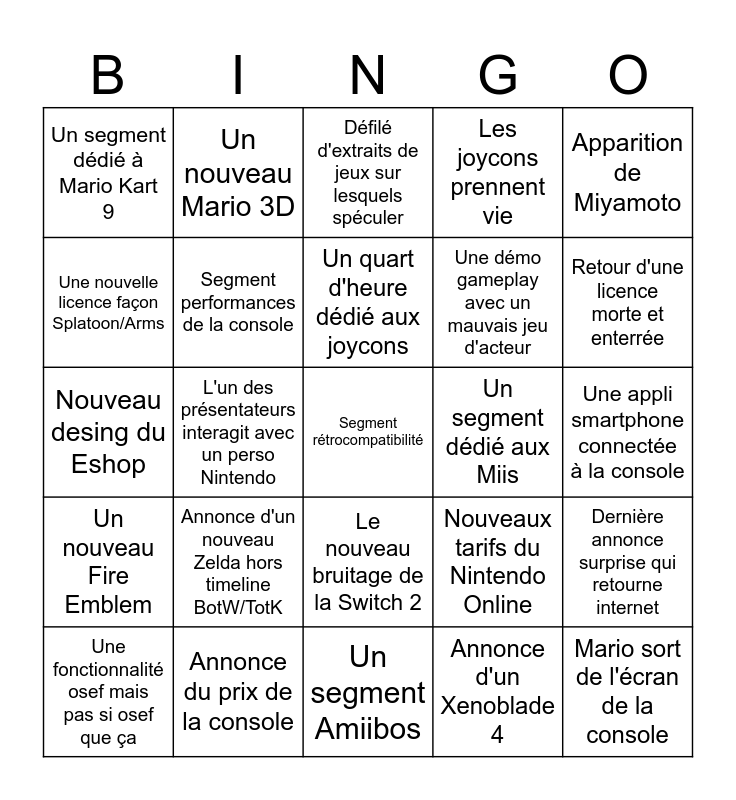 This bingo card has a free space and 24 words: Annonce d'un nouveau Zelda hors timeline BotW/TotK, Annonce du prix de la console, Un quart d'heure dédié aux joycons, Une fonctionnalité osef mais pas si osef que ça, Apparition de Miyamoto, Un segment dédié à Mario Kart 9, Une nouvelle licence façon Splatoon/Arms, Un nouveau Mario 3D, Un segment dédié aux Miis, Le nouveau bruitage de la Switch 2, Une démo gameplay avec un mauvais jeu d'acteur, Nouveau desing du Eshop, Nouveaux tarifs du Nintendo Online, Dernière annonce surprise qui retourne internet, Segment performances de la console, Annonce d'un Xenoblade 4, Une appli smartphone connectée à la console, Défilé d'extraits de jeux sur lesquels spéculer, Retour d'une licence morte et enterrée, L'un des présentateurs interagit avec un perso Nintendo, Mario sort de l'écran de la console, Un nouveau Fire Emblem, Les joycons prennent vie and Un segment Amiibos.