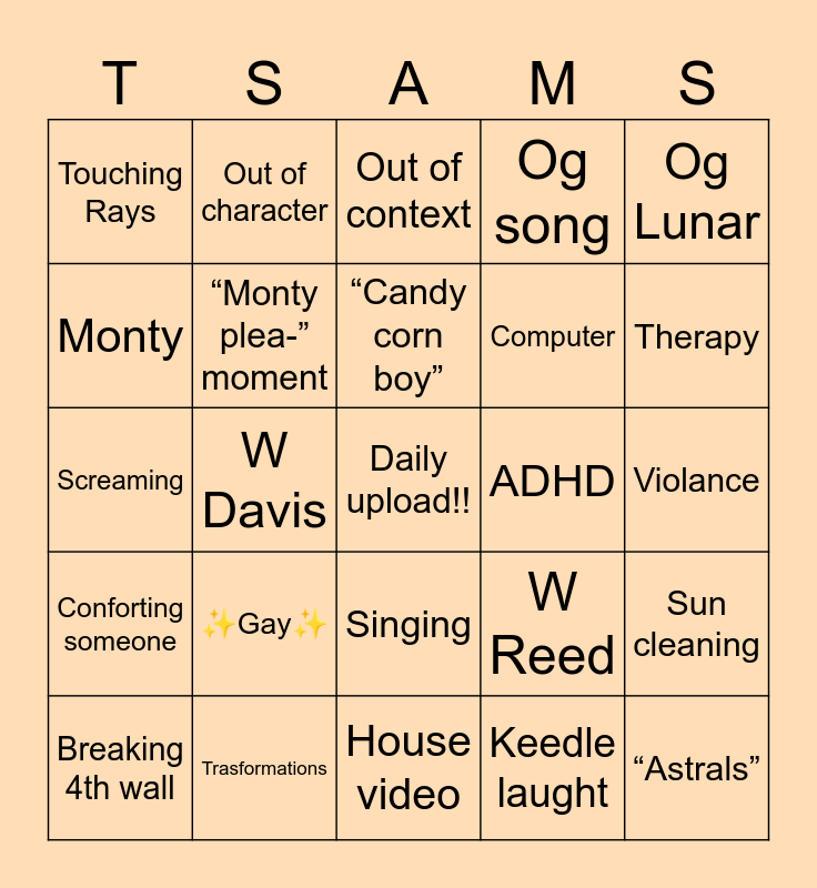 This bingo card has a free space and 50 words: Lore video, “Astrals”, Daycare video, House video, ✨Gay✨, Solar, Out of character, Stress, Monty, Swear words, “Monty plea-” moment, Og song, Sun cleaning, W Reed, Stupid shenaningains, Old Daycare, “Candy corn boy”, ADHD, Og Eclipse, Og Lunar, W Davis, Keedle laught, Touching Rays, Computer, Trauma, Sun’s cats, Therapy, Rage, Out of context, Singing, “Watch till the end”, Sassiness, Bald, Villains, Trasformations, Death of someone, Introduzing someone, Back from the dead, Flashback, Violance, Moon’s stick, Blinking eyes, “Boop”, “……”, Breaking 4th wall, Screaming, Crossover, Jack, Conforting someone and Teasing someone.