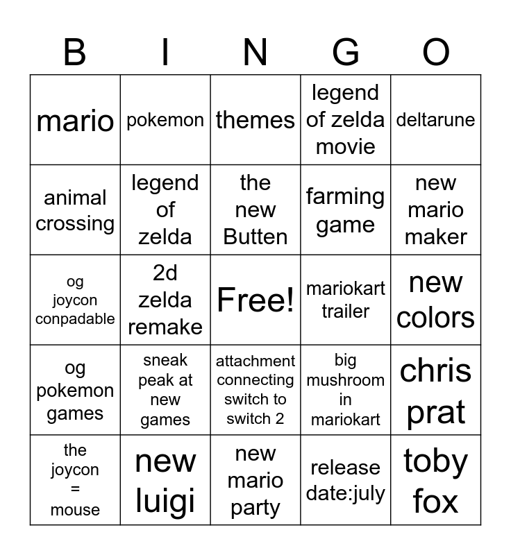 This bingo card has a free space and 24 words: the joycon = mouse, sneak peak at new games, the new Butten, release date:july, deltarune, mario, pokemon, themes, mariokart trailer, new colors, og joycon conpadable, legend of zelda, big mushroom in mariokart, chris prat, animal crossing, new luigi, new mario party, legend of zelda movie, new mario maker, og pokemon games, 2d zelda remake, attachment connecting switch to switch 2, farming game and toby fox.
