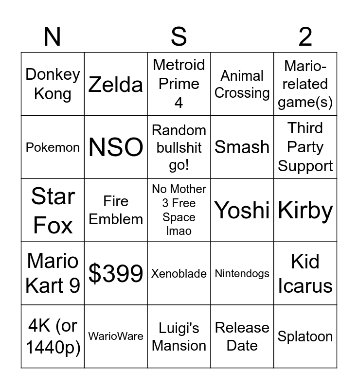 This bingo card has a free space and 24 words: 4K (or 1440p), $399, Random bullshit go!, Release Date, Mario-related game(s), Donkey Kong, Zelda, Metroid Prime 4, Yoshi, Kirby, Star Fox, NSO, Nintendogs, Kid Icarus, Pokemon, WarioWare, Luigi's Mansion, Animal Crossing, Third Party Support, Mario Kart 9, Fire Emblem, Xenoblade, Smash and Splatoon.