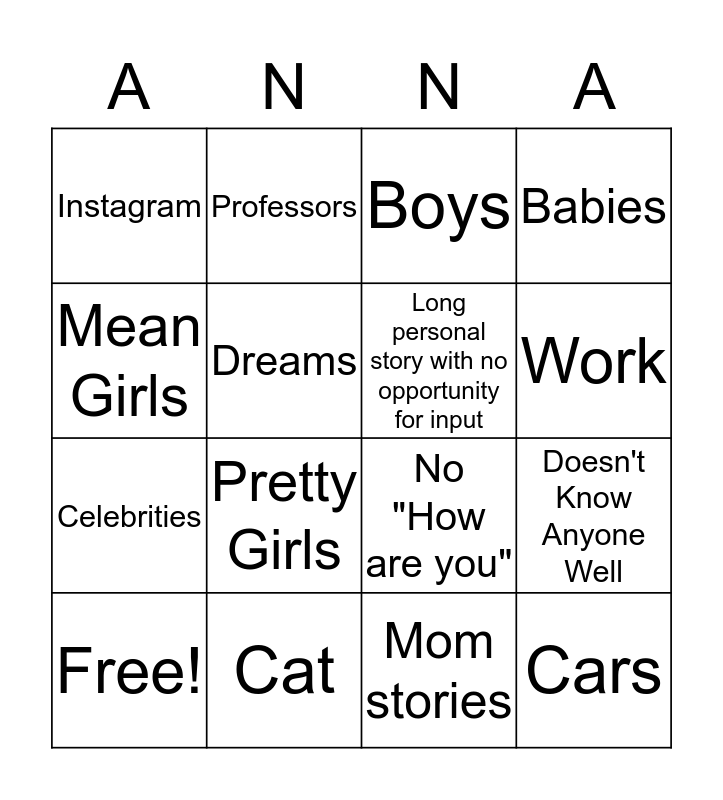 This bingo card has a free space and 15 words: Free!, Cars, Boys, Instagram, Work, Mean Girls, Pretty Girls, Mom stories, Dreams, Celebrities, Doesn't Know Anyone Well, Babies, Long personal story with no opportunity for input, Professors and Cat.