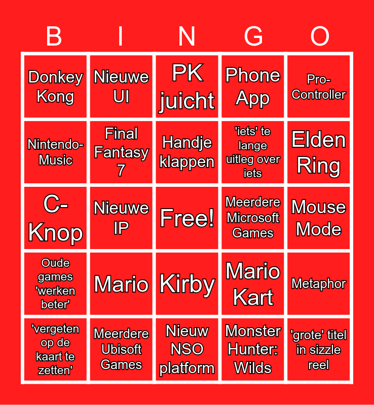 This bingo card has a free space and 24 words: Mario, Meerdere Ubisoft Games, Handje klappen, 'vergeten op de kaart te zetten', Pro-Controller, Donkey Kong, Nintendo-Music, Nieuwe UI, Meerdere Microsoft Games, Kirby, 'iets' te lange uitleg over iets, C-Knop, Mario Kart, Metaphor, Final Fantasy 7, Monster Hunter: Wilds, Mouse Mode, PK juicht, Elden Ring, Nieuwe IP, 'grote' titel in sizzle reel, Oude games 'werken beter', Phone App and Nieuw NSO platform.