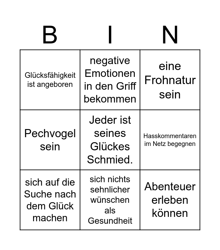 This bingo card has 9 words: sich auf die Suche nach dem Glück machen, eine Frohnatur sein, negative Emotionen in den Griff bekommen, Pechvogel sein, Glücksfähigkeit ist angeboren, Hasskommentaren im Netz begegnen, Jeder ist seines Glückes Schmied., Abenteuer erleben können and sich nichts sehnlicher wünschen als Gesundheit.