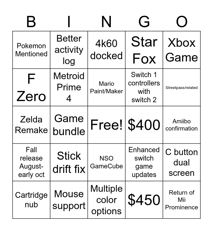 This bingo card has a free space and 35 words: 3D Mario, Odyssey 2, Splatoon 4, Metroid Prime 4, NSO GameCube, Star Fox, F Zero, Switch 2 Sports, Mario Paint/Maker, Smash Mention, Zelda Remake, Xbox Game, Call of duty, Soccer, Pokemon Mentioned, $400, $450, Game bundle, Fall release August-early oct, Return of Mii Prominence, Enhanced switch game updates, Cartridge nub, C button dual screen, Mouse support, 4k60 docked, Streetpass/related, Achievements, No IR sensor, Switch 1 controllers with switch 2, Amiibo confirmation, Nintendo Today/music apps integration, Multiple color options, Stick drift fix, Better activity log and Better motion controls.