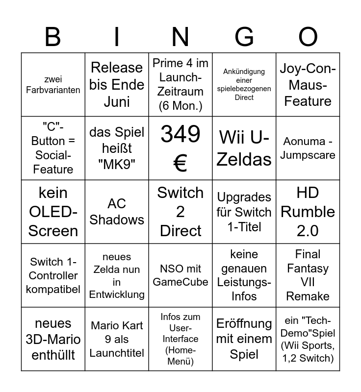 This bingo card has a free space and 24 words: neues Zelda nun in Entwicklung, Mario Kart 9 als Launchtitel, 349 €, neues 3D-Mario enthüllt, Joy-Con-Maus-Feature, zwei Farbvarianten, "C"-Button = Social-Feature, Release bis Ende Juni, Upgrades für Switch 1-Titel, NSO mit GameCube, Wii U-Zeldas, kein OLED-Screen, keine genauen Leistungs-Infos, Final Fantasy VII Remake, das Spiel heißt "MK9", Eröffnung mit einem Spiel, HD Rumble 2.0, Prime 4 im Launch-Zeitraum (6 Mon.), Aonuma -Jumpscare, AC Shadows, ein "Tech-Demo"Spiel (Wii Sports, 1,2 Switch), Switch 1-Controller kompatibel, Ankündigung einer spielebezogenen Direct and Infos zum User-Interface (Home-Menü).