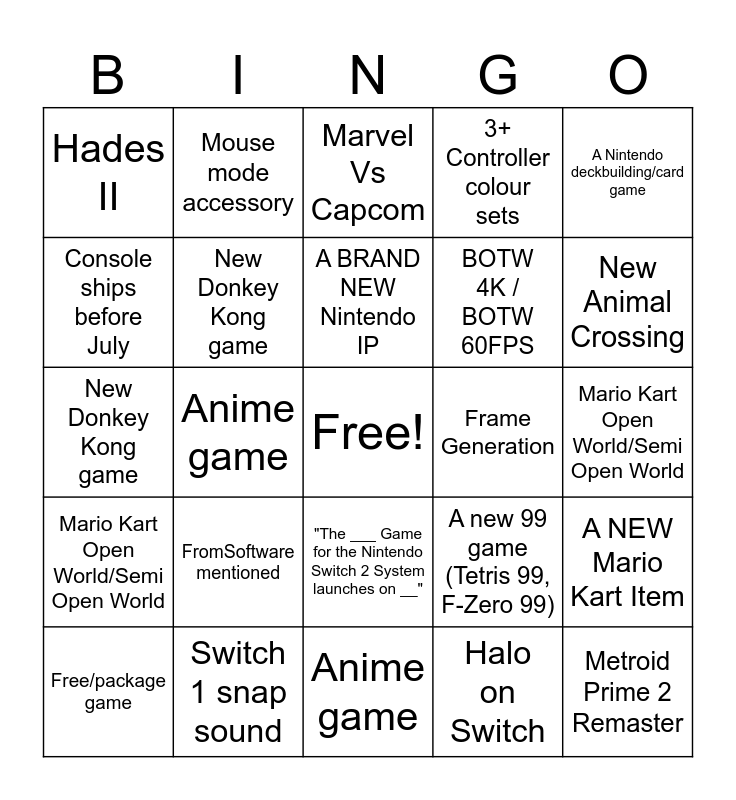 This bingo card has a free space and 125 words: New Smash Bros. Teaser, Mainline Mario Announced, Drift-less joycons, Switch 2 exclusive cozy farm simulator, "The ___ Game for the Nintendo Switch 2 System launches on __", Sakurai reveals himself, Mario Kart Open World/Semi Open World, Gamepass on Switch, Halo on Switch, Zelda announcement, Valorant/CS2/Competitive FPS on Switch 2 mouse mode, Generation 10/X Pokemon, Gamecube Virtual Console/NSO Classics, New Platinum Games title, New Star Fox, New Pikmin, Switch 1 snap sound, Over £450, New Kirby game, Mother game, Free/package game, New Donkey Kong game, Nintendo Theme Park Mention, Silksong, Final Fantasy 9, A BRAND NEW Nintendo IP, 3+ Controller colour sets, Someone will get choked out, We will hear Bowser laugh, Streetpass will return, A NEW Mario Kart Item, Marvel Vs Capcom, Anime game, FromSoftware mentioned, Valve/Steam mentioned, Gravity Rush, Metroid Prime 2 Remaster, A Battle Royale game, A new 99 game (Tetris 99, F-Zero 99), New ARMS game, Hades II, Preorder available within a week, Nintendo Labo will return, Mainline Pokemon will come to NSO, New Animal Crossing, There will be a real life prop, Switch game boxes will be different dimensions, A Nintendo deckbuilding/card game, The C button is just for Capture, New Fire Emblem game, New Pikmin, Bethesda mention, Switch 2 will have UI themes, New Atlus game, Ds pokemon re-release, Wii U mode, Amiibo returns, BOTW 4K / BOTW 60FPS, No OLED, Frame Generation, Console ships before July, Mouse mode accessory, New Nintendo or Mario sports game, New Smash Bros. Teaser, Mainline Mario Announced, Drift-less joycons, Switch 2 exclusive cozy farm simulator, "The ___ Game for the Nintendo Switch 2 System launches on __", Sakurai reveals himself, Mario Kart Open World/Semi Open World, Gamepass on Switch, Halo on Switch, Zelda announcement, Valorant/CS2/Competitive FPS on Switch 2 mouse mode, Generation 10/X Pokemon, Gamecube Virtual Console/NSO Classics, New Platinum Games title, New Star Fox, New Pikmin, Switch 1 snap sound, Over £450, New Kirby game, Mother game, Free/package game, New Donkey Kong game, Nintendo Theme Park Mention, Silksong, Final Fantasy 9, A BRAND NEW Nintendo IP, 3+ Controller colour sets, Someone will get choked out, We will hear Bowser laugh, Streetpass will return, A NEW Mario Kart Item, Marvel Vs Capcom, Anime game, FromSoftware mentioned, Valve/Steam mentioned, Gravity Rush, Metroid Prime 2 Remaster, A Battle Royale game, A new 99 game (Tetris 99, F-Zero 99), New ARMS game, Hades II, Preorder available within a week, Nintendo Labo will return, Mainline Pokemon will come to NSO, New Animal Crossing, There will be a real life prop, Switch game boxes will be different dimensions, A Nintendo deckbuilding/card game, The C button is just for Capture, New Fire Emblem game, Bethesda mention, Switch 2 will have UI themes, New Atlus game, Ds pokemon re-release, Wii U mode, Amiibo returns, BOTW 4K / BOTW 60FPS, No OLED, Frame Generation, Console ships before July, Mouse mode accessory and New Nintendo or Mario sports game.
