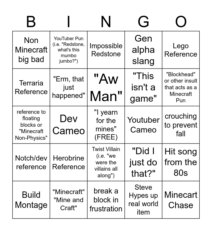 This bingo card has a free space and 24 words: Herobrine Reference, "Minecraft" "Mine and Craft", "Aw Man", Build Montage, Lego Reference, Non Minecraft big bad, Terraria Reference, YouTuber Pun (i.e. "Redstone, what's this mumbo jumbo?"), Youtuber Cameo, Twist Villain (i.e. "we were the villains all along"), "This isn't a game", reference to floating blocks or "Minecraft Non-Physics", "Did I just do that?", Hit song from the 80s, "Erm, that just happened", Steve Hypes up real world item, crouching to prevent fall, Impossible Redstone, "Blockhead" or other insult that acts as a Minecraft Pun, Dev Cameo, Minecart Chase, Notch/dev reference, Gen alpha slang and break a block in frustration.