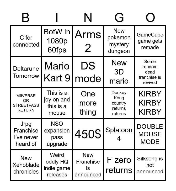 This bingo card has a free space and 24 words: New Xenoblade chronicles, NSO expansion pass upgrade, DS mode, F zero returns, GameCube game gets remade, C for connected, BotW in 1080p 60fps, Arms 2, Donkey Kong country returns returns, KIRBY KIRBY KIRBY, MIIVERSE OR STREETPASS RETURN, Mario Kart 9, Splatoon 4, DOUBLE MOUSE MODE, Deltarune Tomorrow, Weird oddly HQ indie game releases, New Franchise is announced, New pokemon mystery dungeon, Some random dead franchise is revived, Jrpg Franchise I've never heard of, This is a joy on and this is a mouse, 450$, New 3D mario and Silksong is not announced.