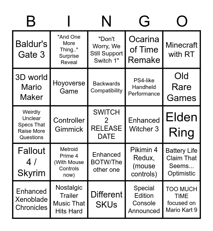 This bingo card has a free space and 39 words: New 3D Mario,not 3D world, FF9 Remake, Call of Duty, Hoyoverse Game, Enhanced Xenoblade Chronicles, Enhanced BOTW/The other one, Backwards Compatibility, Cyberpunk 2077, Minecraft with RT, Fallout 4 / Skyrim, Controller Gimmick, Ocarina of Time Remake, TOO MUCH TIME focused on Mario Kart 9, Elden Ring, Enhanced Witcher 3, Metroid Prime 4 (With Mouse Controls now), "Only" $399.99, Baldur's Gate 3, September - October Launch, Pikimin 4 Redux, (mouse controls), 3D world Mario Maker, Different SKUs, PS4-like Handheld Performance, Old Rare Games, "Most Powerful Nintendo Console Ever" Statement, "New Way to Play" Gimmick Tease, Day-One Game Pass-Like Subscription, Third-Party Sizzle Reel (With Old Ports), Weird, Out-of-Place Celebrity Cameo, "And One More Thing.." Surprise Reveal, Developers Saying How Excited They Are to Work With It, Weird, Unexplained Accessory Tease, "Don't Worry, We Still Support Switch 1", Nostalgic Trailer Music That Hits Hard, Special Edition Console Announced, Weirdly Long Montage Families Smiling While Playing, Battery Life Claim That Seems... Optimistic, Weirdly Unclear Specs That Raise More Questions and More Details in a Future Nintendo Direct.