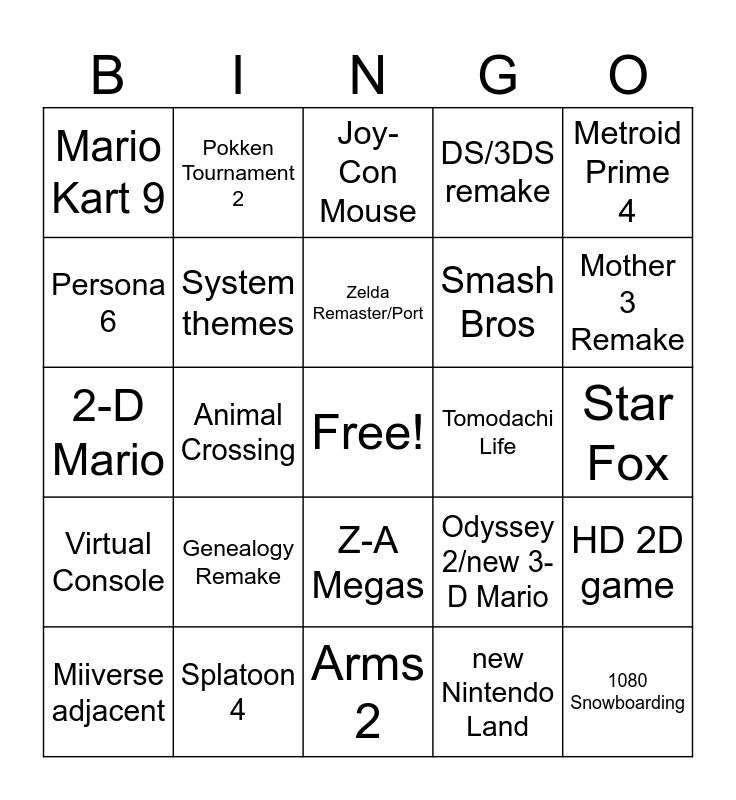 This bingo card has a free space and 24 words: Genealogy Remake, Splatoon 4, Zelda Remaster/Port, Miiverse adjacent, Metroid Prime 4, Mario Kart 9, Persona 6, Pokken Tournament 2, Tomodachi Life, Z-A Megas, Smash Bros, 2-D Mario, Odyssey 2/new 3-D Mario, HD 2D game, System themes, new Nintendo Land, Star Fox, Joy-Con Mouse, Mother 3 Remake, Animal Crossing, 1080 Snowboarding, Virtual Console, DS/3DS remake and Arms 2.