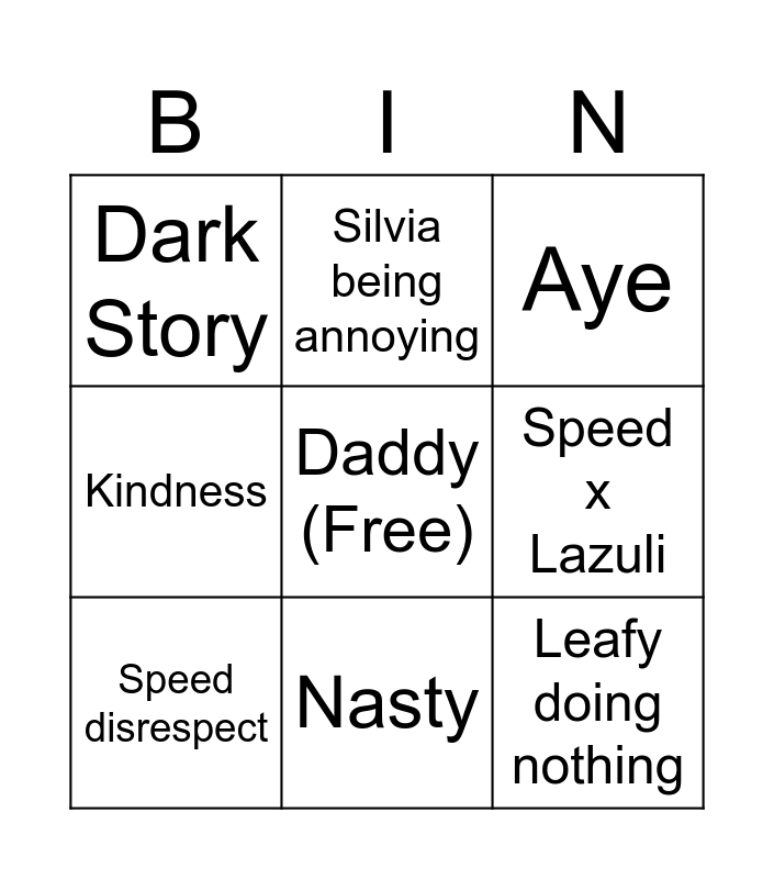 This bingo card has a free space and 8 words: Speed x Lazuli, Aye, Silvia being annoying, Speed disrespect, Dark Story, Leafy doing nothing, Kindness and Nasty.