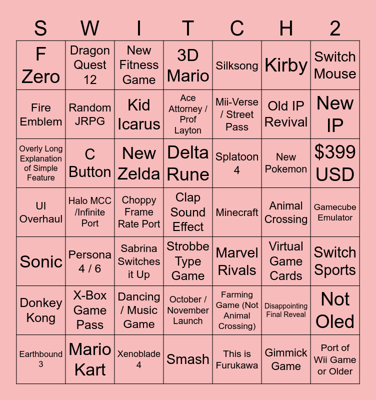 This bingo card has a free space and 48 words: Farming Game (Not Animal Crossing), Old IP Revival, Smash, Halo MCC /Infinite Port, New Zelda, Gamecube Emulator, Dragon Quest 12, Mario Kart, Kirby, Strobbe Type Game, Switch Mouse, 3D Mario, New Pokemon, Splatoon 4, Donkey Kong, Animal Crossing, Fire Emblem, New IP, Disappointing Final Reveal, Silksong, Mii-Verse / Street Pass, Choppy Frame Rate Port, F Zero, Random JRPG, Not Oled, Kid Icarus, $399 USD, Earthbound 3, Delta Rune, C Button, Gimmick Game, Minecraft, Switch Sports, X-Box Game Pass, UI Overhaul, Marvel Rivals, Virtual Game Cards, Overly Long Explanation of Simple Feature, Sabrina Switches it Up, Dancing / Music Game, Sonic, Port of Wii Game or Older, New Fitness Game, Xenoblade 4, Ace Attorney / Prof Layton, October / November Launch, Persona 4 / 6 and This is Furukawa.