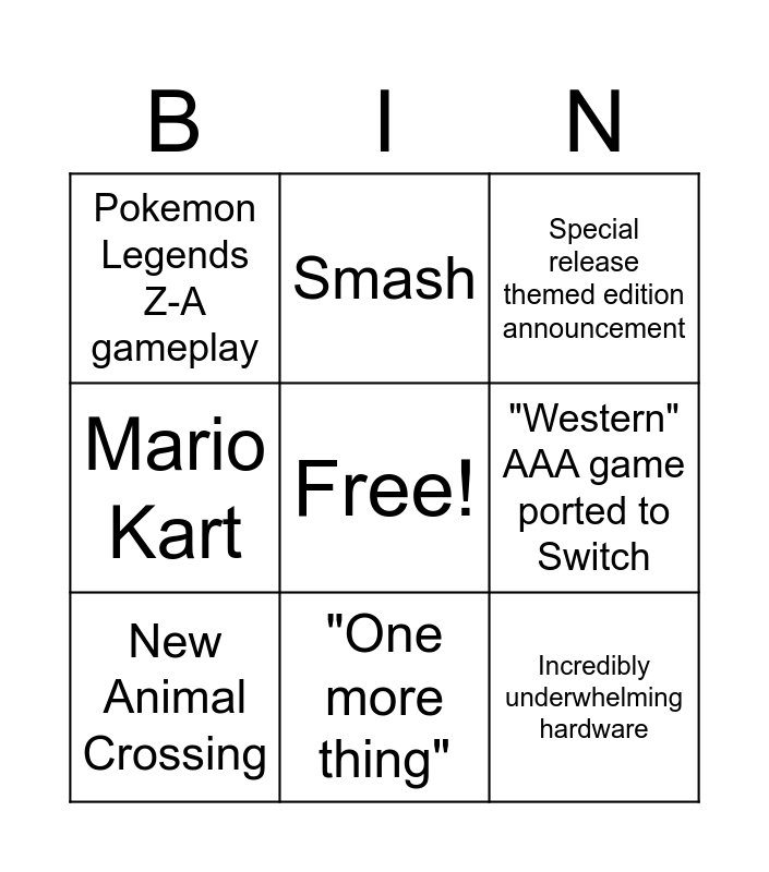 This bingo card has a free space and 8 words: "Western" AAA game ported to Switch, Special release themed edition announcement, Smash, New Animal Crossing, Pokemon Legends Z-A gameplay, Incredibly underwhelming hardware, Mario Kart and "One more thing".