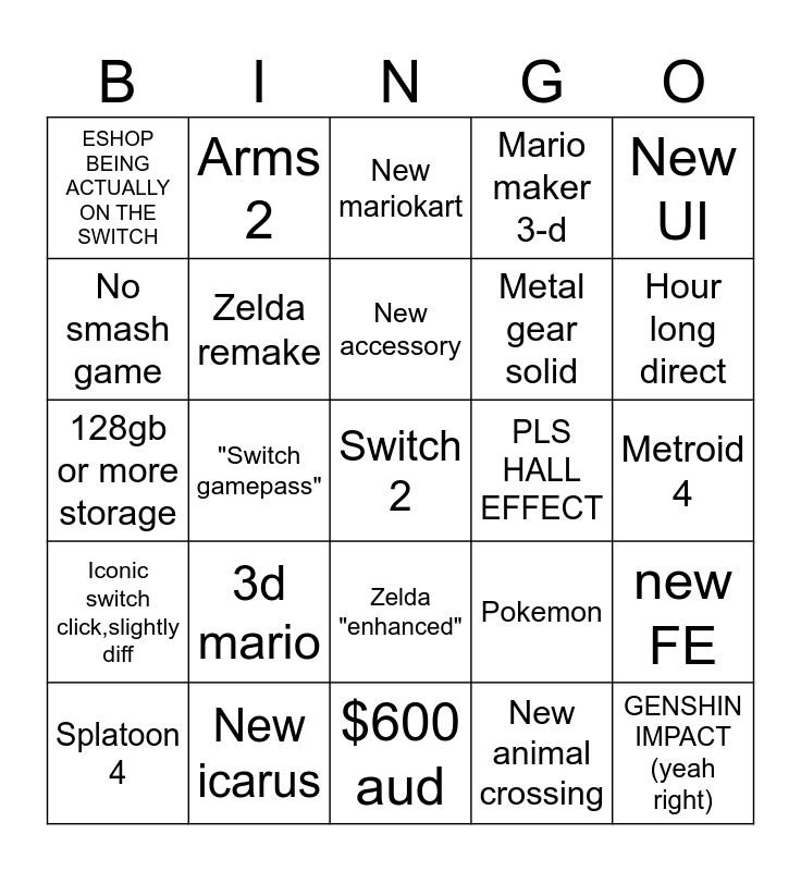 This bingo card has a free space and 24 words: Splatoon 4, 3d mario, New accessory, New animal crossing, New UI, ESHOP BEING ACTUALLY ON THE SWITCH, Arms 2, New mariokart, PLS HALL EFFECT, Metroid 4, 128gb or more storage, Zelda remake, Pokemon, new FE, No smash game, New icarus, $600 aud, Mario maker 3-d, Hour long direct, Iconic switch click,slightly diff, "Switch gamepass", Zelda "enhanced", Metal gear solid and GENSHIN IMPACT (yeah right).