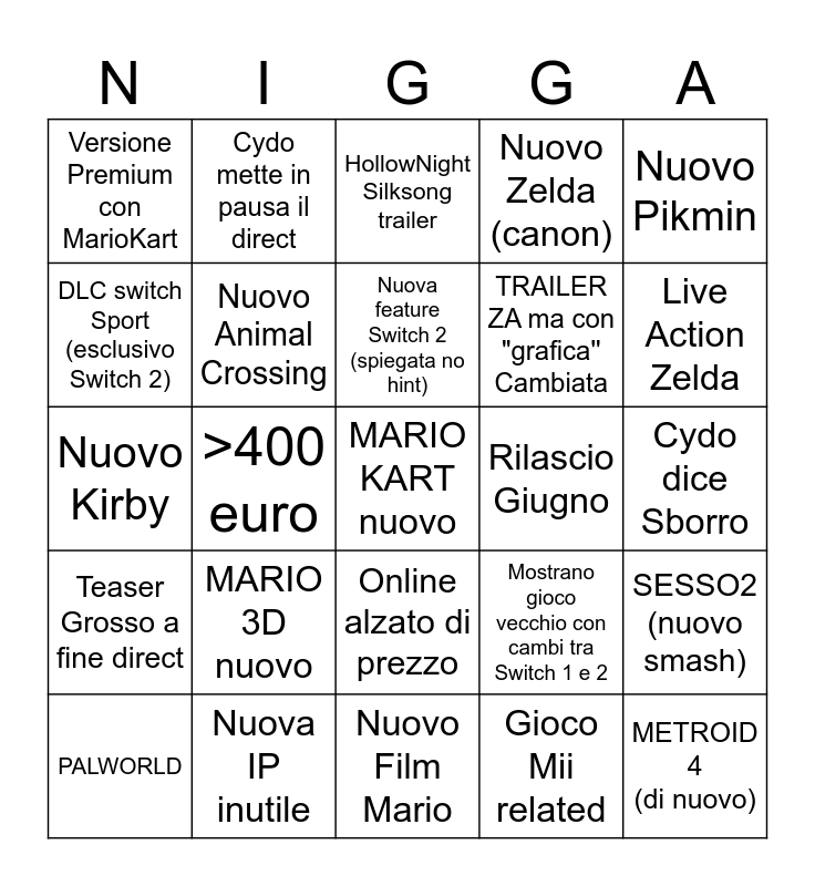 This bingo card has a free space and 24 words: MARIO 3D nuovo, Nuova IP inutile, Nuova feature Switch 2 (spiegata no hint), PALWORLD, Nuovo Pikmin, Versione Premium con MarioKart, DLC switch Sport (esclusivo Switch 2), Cydo mette in pausa il direct, Rilascio Giugno, Online alzato di prezzo, TRAILER ZA ma con "grafica'' Cambiata, Nuovo Kirby, Mostrano gioco vecchio con cambi tra Switch 1 e 2, SESSO2 (nuovo smash), Nuovo Animal Crossing, Gioco Mii related, Cydo dice Sborro, HollowNight Silksong trailer, Live Action Zelda, >400 euro, METROID 4 (di nuovo), Teaser Grosso a fine direct, Nuovo Zelda (canon) and Nuovo Film Mario.