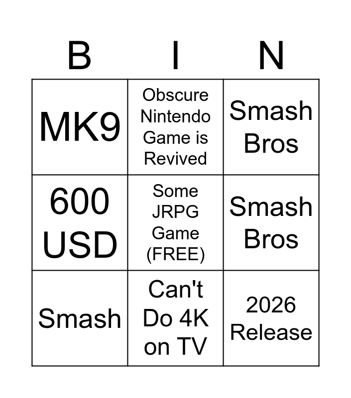 This bingo card has a free space and 12 words: 600 USD, New 3D Mario Game, 2026 Release, Smash Bros, Obscure Nintendo Game is Revived, Smash Bros, Can't Do 4K on TV, Mario Kart, MK9, 600 USD, Smash and Can't do 4K on Display.