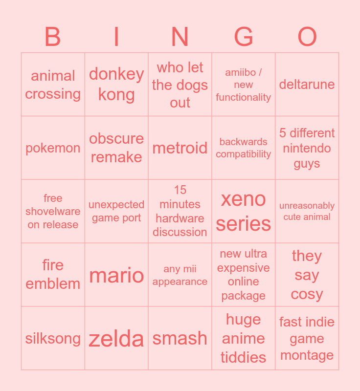 This bingo card has a free space and 24 words: mario, zelda, metroid, silksong, deltarune, animal crossing, pokemon, donkey kong, xeno series, any mii appearance, backwards compatibility, free shovelware on release, new ultra expensive online package, they say cosy, obscure remake, huge anime tiddies, unreasonably cute animal, who let the dogs out, 5 different nintendo guys, unexpected game port, fast indie game montage, fire emblem, amiibo / new functionality and smash.