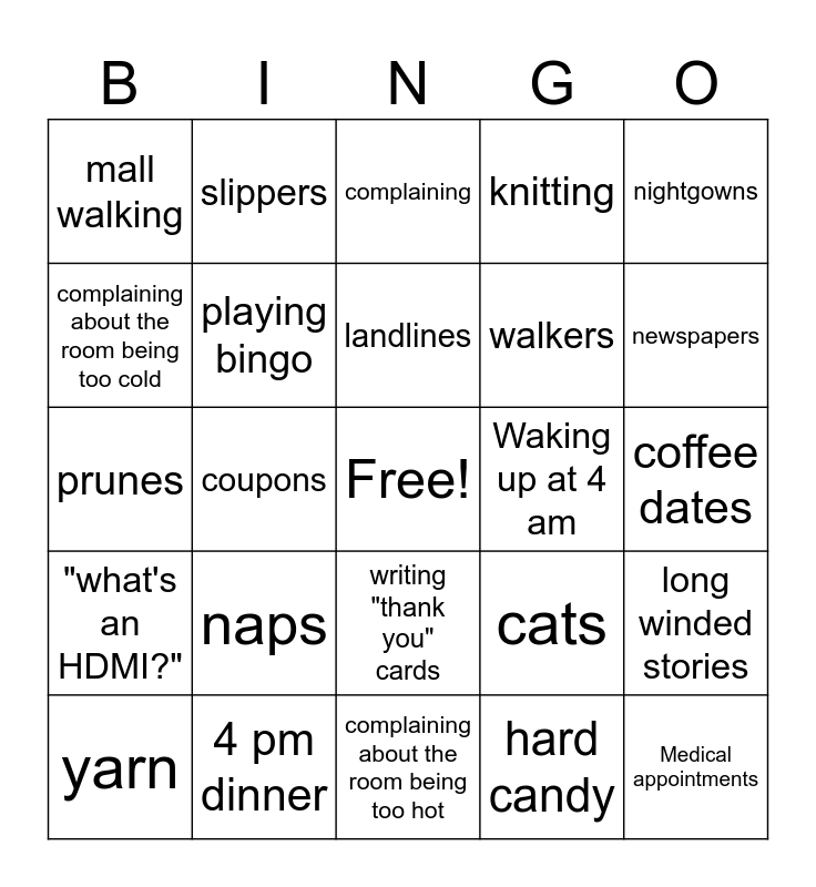 This bingo card has a free space and 27 words: cats, canes, walkers, complaining about the room being too hot, complaining about the room being too cold, complaining, slippers, "what's an HDMI?", Waking up at 4 am, long winded stories, prunes, knitting, yarn, 4 pm dinner, newspapers, Facebook, playing bingo, landlines, naps, mall walking, coffee dates, hard candy, coupons, Medical appointments, writing "thank you" cards, nightgowns and complaining about being old.