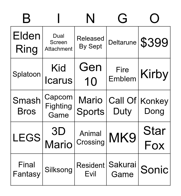 This bingo card has 25 words: 3D Mario, Resident Evil, Gen 10, Final Fantasy, $399, Elden Ring, Splatoon, Dual Screen Attachment, Call Of Duty, Animal Crossing, Fire Emblem, Smash Bros, MK9, Star Fox, Kid Icarus, Sonic, Konkey Dong, Released By Sept, Kirby, Capcom Fighting Game, Mario Sports, Silksong, LEGS, Deltarune and Sakurai Game.