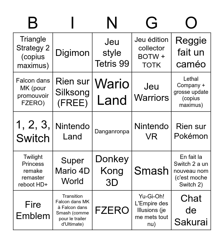 This bingo card has 25 words: Super Mario 4D World, FZERO, Wario Land, Fire Emblem, Reggie fait un caméo, Triangle Strategy 2 (copius maximus), Falcon dans MK (pour promouvoir FZERO), Digimon, Nintendo VR, Donkey Kong 3D, Jeu Warriors, 1, 2, 3, Switch, Smash, En fait la Switch 2 a un nouveau nom (c'est moche Switch 2), Rien sur Silksong (FREE), Chat de Sakurai, Rien sur Pokémon, Jeu style Tetris 99, Lethal Company + grosse update (copius maximus), Nintendo Land, Danganronpa, Transition Falcon dans MK à Falcon dans Smash (comme pour le trailer d'Ultimate), Twilight Princess remake remaster reboot HD+, Jeu édition collector BOTW + TOTK and Yu-Gi-Oh! L'Empire des Illusions (je me mets tout nu).
