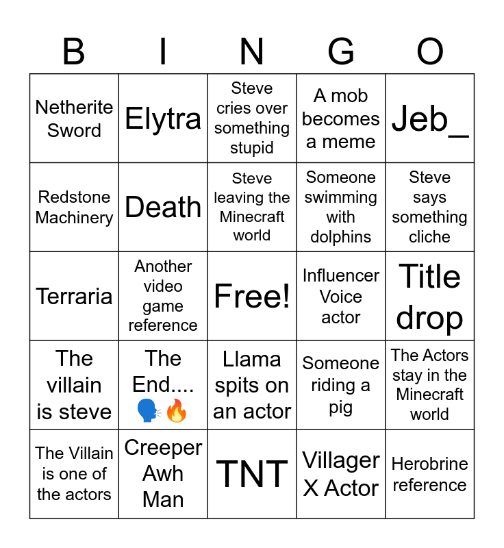 This bingo card has a free space and 24 words: The End....🗣️🔥, Creeper Awh Man, Steve leaving the Minecraft world, The Villain is one of the actors, Jeb_, Netherite Sword, Redstone Machinery, Elytra, Influencer Voice actor, Llama spits on an actor, Someone swimming with dolphins, Terraria, Someone riding a pig, The Actors stay in the Minecraft world, Death, Villager X Actor, Title drop, Steve cries over something stupid, Steve says something cliche, Another video game reference, Herobrine reference, The villain is steve, A mob becomes a meme and TNT.