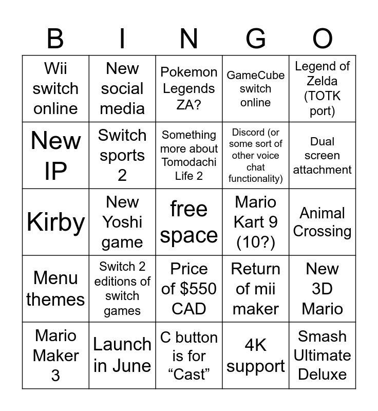 This bingo card has a free space and 24 words: Switch 2 editions of switch games, Launch in June, Something more about Tomodachi Life 2, Mario Maker 3, Legend of Zelda (TOTK port), Wii switch online, New IP, New social media, Mario Kart 9 (10?), Price of $550 CAD, Discord (or some sort of other voice chat functionality), Kirby, Return of mii maker, New 3D Mario, Switch sports 2, 4K support, Animal Crossing, Pokemon Legends ZA?, Dual screen attachment, New Yoshi game, Smash Ultimate Deluxe, Menu themes, GameCube switch online and C button is for “Cast”.