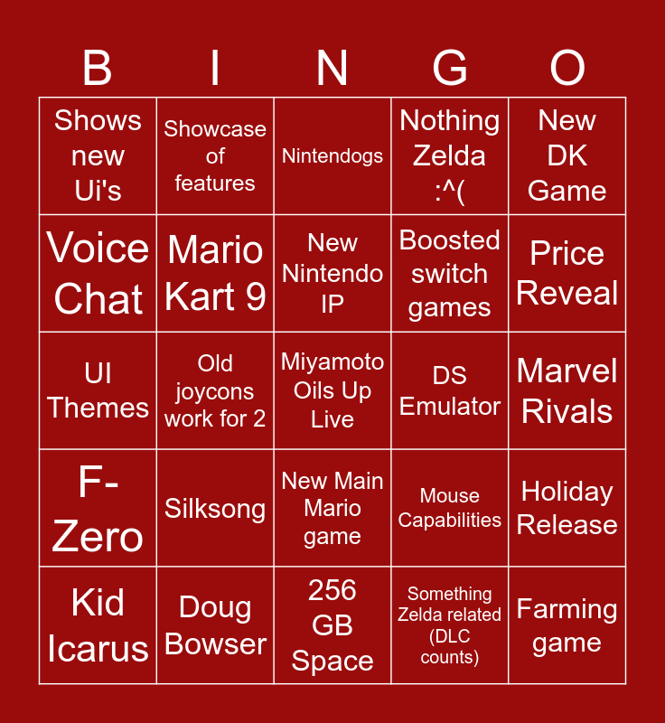 This bingo card has a free space and 24 words: Silksong, Doug Bowser, New Nintendo IP, Kid Icarus, New DK Game, Shows new Ui's, Voice Chat, Showcase of features, DS Emulator, New Main Mario game, Boosted switch games, UI Themes, Mouse Capabilities, Holiday Release, Mario Kart 9, Something Zelda related (DLC counts), Marvel Rivals, Nintendogs, Price Reveal, Old joycons work for 2, Farming game, F-Zero, Nothing Zelda :^( and 256 GB Space.