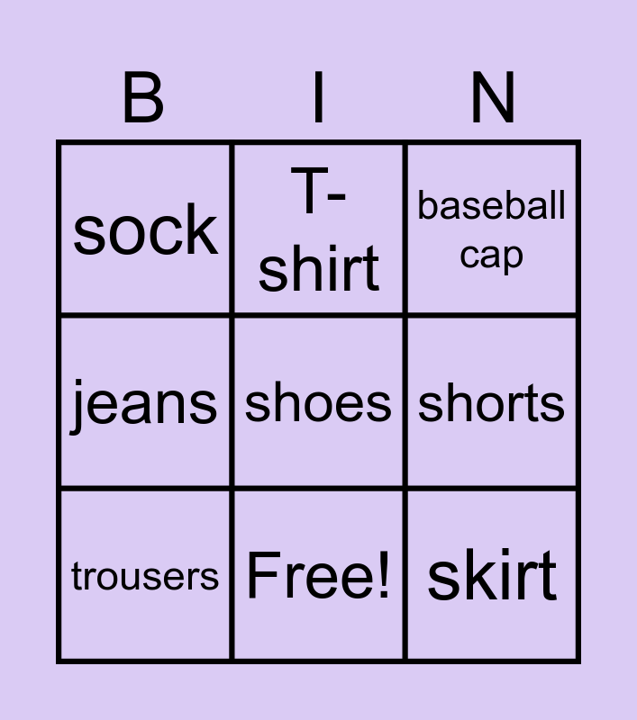 This bingo card has 10 words: Free!, baseball cap, sock, shoes, jeans, trousers, T-shirt, jacket, shorts and skirt.