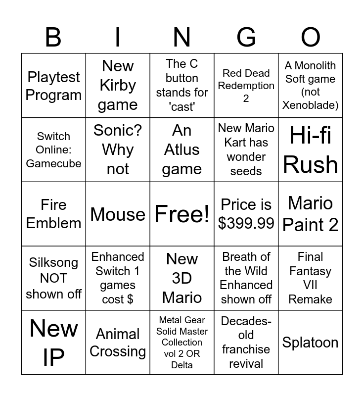 This bingo card has a free space and 24 words: Enhanced Switch 1 games cost $, Animal Crossing, An Atlus game, New IP, A Monolith Soft game (not Xenoblade), Playtest Program, Switch Online: Gamecube, New Kirby game, Price is $399.99, New 3D Mario, New Mario Kart has wonder seeds, Fire Emblem, Breath of the Wild Enhanced shown off, Final Fantasy VII Remake, Sonic? Why not, Decades-old franchise revival, Mario Paint 2, The C button stands for 'cast', Hi-fi Rush, Mouse, Splatoon, Silksong NOT shown off, Red Dead Redemption 2 and Metal Gear Solid Master Collection vol 2 OR Delta.