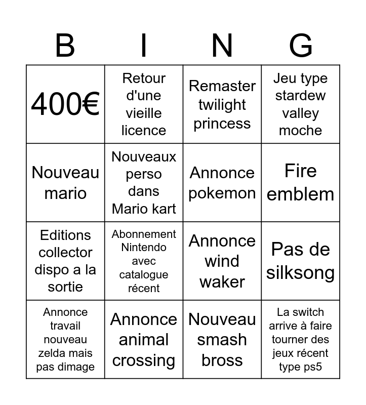 This bingo card has 16 words: Annonce animal crossing, Pas de silksong, Remaster twilight princess, 400€, Editions collector dispo a la sortie, Retour d'une vieille licence, Annonce wind waker, Nouveau smash bross, Nouveau mario, Nouveaux perso dans Mario kart, Annonce travail nouveau zelda mais pas dimage, Jeu type stardew valley moche, Abonnement Nintendo avec catalogue récent, Fire emblem, Annonce pokemon and La switch arrive à faire tourner des jeux récent type ps5.