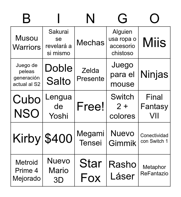 This bingo card has a free space and 24 words: $400, Nuevo Mario 3D, Zelda Presente, Metroid Prime 4 Mejorado, Miis, Musou Warriors, Juego de peleas generación actual al S2, Sakurai se revelará a si mismo, Switch 2 + colores, Megami Tensei, Juego para el mouse, Cubo NSO, Nuevo Gimmik, Conectividad con Switch 1, Doble Salto, Rasho Láser, Final Fantasy VII, Mechas, Ninjas, Lengua de Yoshi, Metaphor ReFantazio, Kirby, Alguien usa ropa o accesorio chistoso and Star Fox.