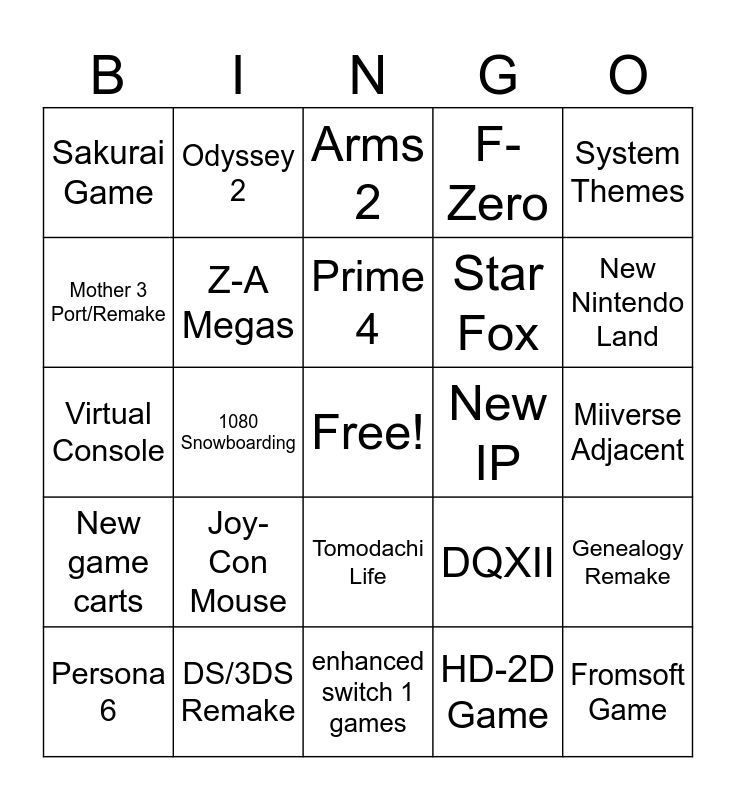 This bingo card has a free space and 24 words: Joy-Con Mouse, DS/3DS Remake, Prime 4, Persona 6, System Themes, Sakurai Game, Mother 3 Port/Remake, Odyssey 2, New IP, Tomodachi Life, Star Fox, Virtual Console, DQXII, Genealogy Remake, Z-A Megas, HD-2D Game, Miiverse Adjacent, Arms 2, New Nintendo Land, 1080 Snowboarding, Fromsoft Game, New game carts, F-Zero and enhanced switch 1 games.