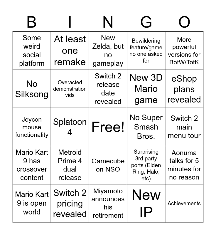 This bingo card has a free space and 24 words: Metroid Prime 4 dual release, Switch 2 pricing revealed, Switch 2 release date revealed, Mario Kart 9 is open world, More powerful versions for BotW/TotK, Some weird social platform, No Silksong, At least one remake, No Super Smash Bros., Gamecube on NSO, New 3D Mario game, Joycon mouse functionality, Surprising 3rd party ports (Elden Ring, Halo, etc), Aonuma talks for 5 minutes for no reason, Overacted demonstration vids, New IP, Switch 2 main menu tour, New Zelda, but no gameplay, eShop plans revealed, Splatoon 4, Achievements, Mario Kart 9 has crossover content, Bewildering feature/game no one asked for and Miyamoto announces his retirement.