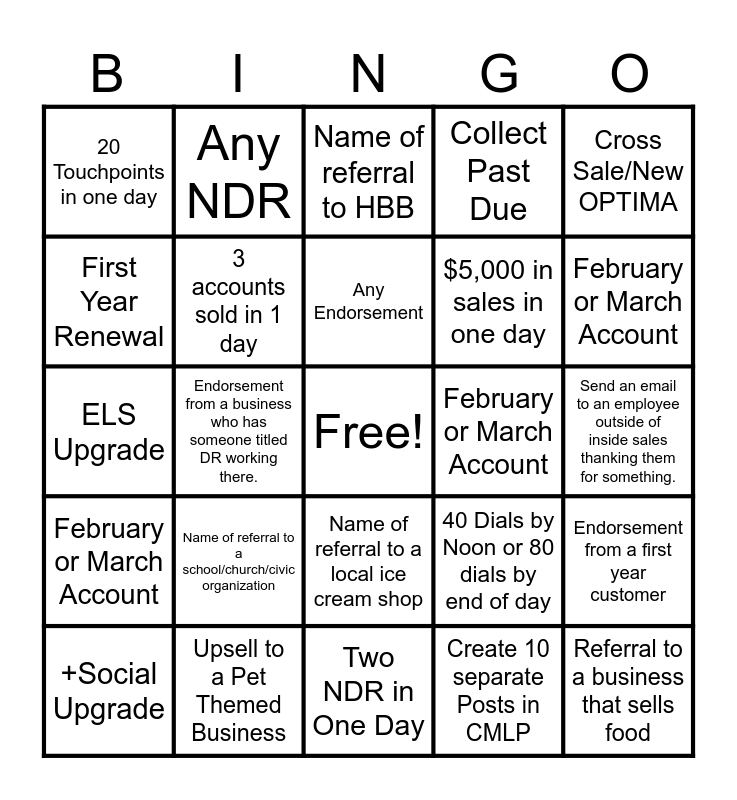 This bingo card has a free space and 24 words: Name of referral to a school/church/civic organization, Upsell to a Pet Themed Business, Any Endorsement, +Social Upgrade, Cross Sale/New OPTIMA, 20 Touchpoints in one day, First Year Renewal, Any NDR, February or March Account, Name of referral to a local ice cream shop, $5,000 in sales in one day, ELS Upgrade, 40 Dials by Noon or 80 dials by end of day, Endorsement from a first year customer, 3 accounts sold in 1 day, Create 10 separate Posts in CMLP, Send an email to an employee outside of inside sales thanking them for something., Name of referral to HBB, February or March Account, Endorsement from a business who has someone titled DR working there., Referral to a business that sells food, February or March Account, Collect Past Due and Two NDR in One Day.