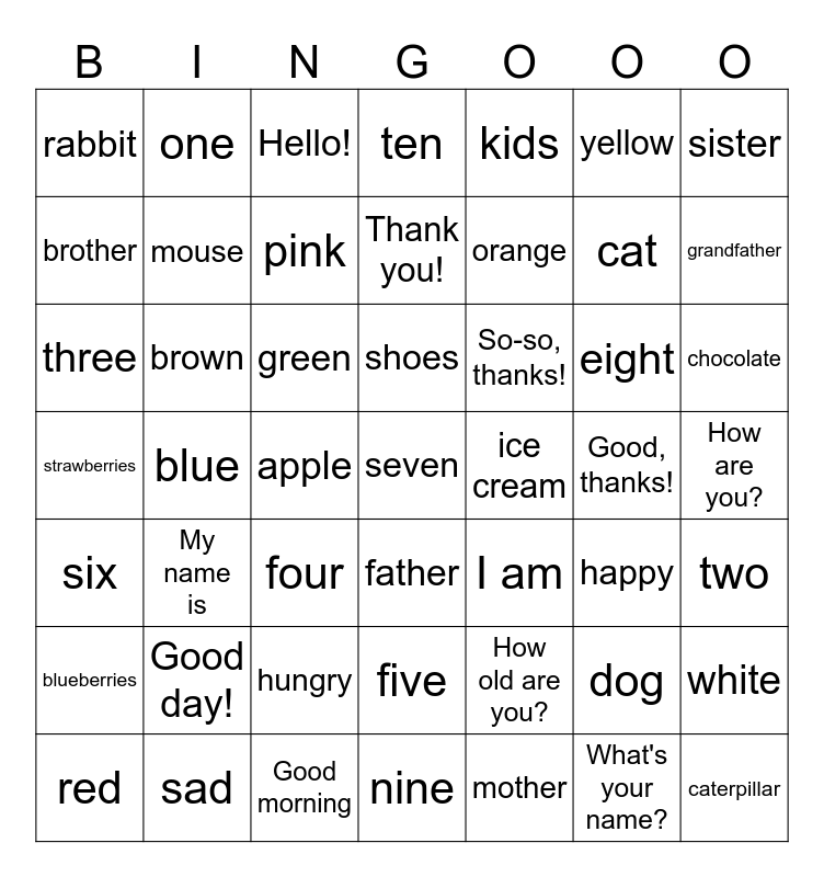 This bingo card has 49 words: dog, cat, mother, blue, green, How are you?, one, Good morning, yellow, father, sister, ten, eight, So-so, thanks!, Good day!, Good, thanks!, brother, grandfather, white, kids, orange, apple, rabbit, mouse, red, pink, chocolate, sad, shoes, brown, caterpillar, ice cream, blueberries, hungry, strawberries, I am, happy, two, three, four, five, six, seven, nine, Thank you!, Hello!, How old are you?, My name is and What's your name?.