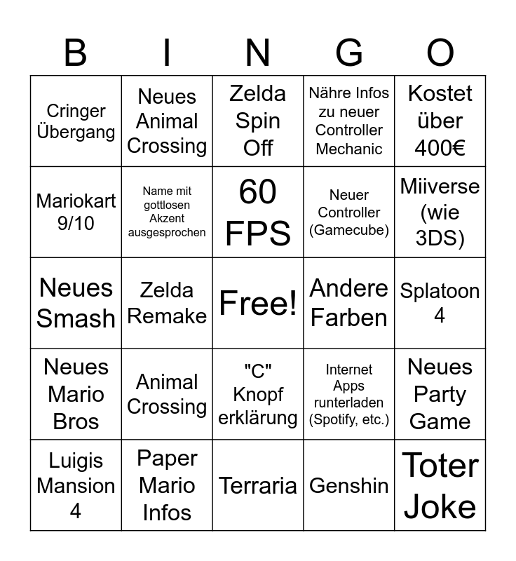 This bingo card has a free space and 24 words: Animal Crossing, Paper Mario Infos, 60 FPS, Luigis Mansion 4, Kostet über 400€, Cringer Übergang, Mariokart 9/10, Neues Animal Crossing, Andere Farben, "C" Knopf erklärung, Neuer Controller (Gamecube), Neues Smash, Internet Apps runterladen (Spotify, etc.), Neues Party Game, Name mit gottlosen Akzent ausgesprochen, Genshin, Splatoon 4, Zelda Spin Off, Miiverse (wie 3DS), Zelda Remake, Toter Joke, Neues Mario Bros, Nähre Infos zu neuer Controller Mechanic and Terraria.