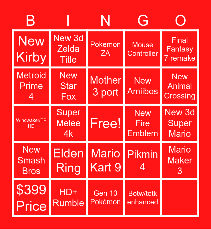 This bingo card has a free space and 24 words: New Smash Bros, HD+ Rumble, Mario Kart 9, Pikmin 4, Final Fantasy 7 remake, New Kirby, New 3d Zelda Title, Pokemon ZA, New Amiibos, Mario Maker 3, Metroid Prime 4, New Star Fox, ARMS 2, New Fire Emblem, New Animal Crossing, $399 Price, Super Melee 4k, Mother 3 port, Mouse Controller, New 3d Super Mario, Windwaker/TP HD, Elden Ring, Gen 10 Pokémon and Botw/totk enhanced.