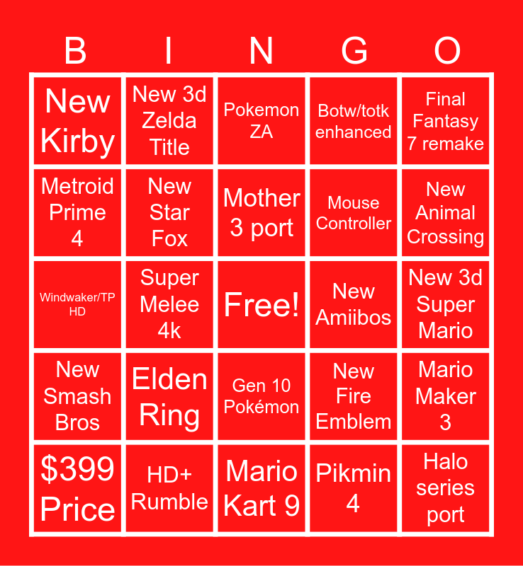 This bingo card has a free space and 25 words: New Smash Bros, HD+ Rumble, Mario Kart 9, Pikmin 4, Final Fantasy 7 remake, New Kirby, New 3d Zelda Title, Pokemon ZA, New Amiibos, Mario Maker 3, Metroid Prime 4, New Star Fox, ARMS 2, New Fire Emblem, New Animal Crossing, $399 Price, Super Melee 4k, Mother 3 port, Mouse Controller, New 3d Super Mario, Windwaker/TP HD, Elden Ring, Gen 10 Pokémon, Botw/totk enhanced and Halo series port.