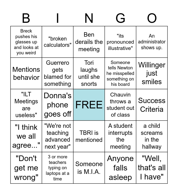 This bingo card has a free space and 29 words: "Don't get me wrong", Newton says something about his sons., Donna's phone goes off, Someone whines., Breck pushes his glasses up and looks at you weird, Ben derails the meeting, Guerrero gets blamed for something, "We're not teaching advanced next year", Chauvin throws a student out of class, 3 or more teachers typing on laptops at a time, Success Criteria, "Well, that's all I have", Someone is M.I.A., Anyone falls asleep, Willinger just smiles, Roger has said something that doesn't line up with Guerrero, TBRI is mentioned, "I think we all agree...", An administrator shows up., "ILT Meetings are useless", A student interrupts the meeting, LEAP, Someone tells Newton he misspelled something on his board, Mentions behavior, "its pronounced illustrative", "broken calculators", a child screams in the hallway, Tori laughs until she snorts and Angela says she needs a nap..