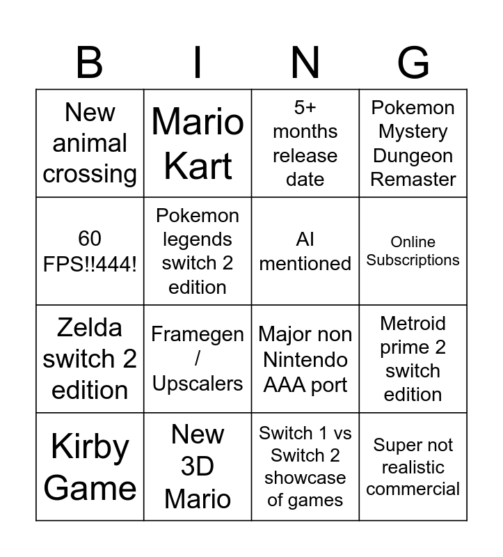 This bingo card has 16 words: New 3D Mario, Metroid prime 2 switch edition, 5+ months release date, New animal crossing, Zelda switch 2 edition, Mario Kart, Major non Nintendo AAA port, Switch 1 vs Switch 2 showcase of games, 60 FPS!!444!, Pokemon legends switch 2 edition, Kirby Game, Pokemon Mystery Dungeon Remaster, Framegen / Upscalers, Online Subscriptions, AI mentioned and Super not realistic commercial.