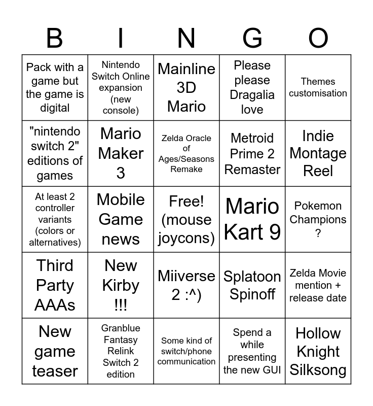 This bingo card has a free space and 24 words: New Kirby !!!, Granblue Fantasy Relink Switch 2 edition, Zelda Oracle of Ages/Seasons Remake, New game teaser, Themes customisation, Pack with a game but the game is digital, "nintendo switch 2" editions of games, Nintendo Switch Online expansion (new console), Mario Kart 9, Miiverse 2 :^), Metroid Prime 2 Remaster, At least 2 controller variants (colors or alternatives), Splatoon Spinoff, Zelda Movie mention + release date, Mario Maker 3, Spend a while presenting the new GUI, Pokemon Champions ?, Mainline 3D Mario, Indie Montage Reel, Mobile Game news, Hollow Knight Silksong, Third Party AAAs, Please please Dragalia love and Some kind of switch/phone communication.