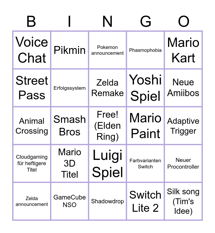 This bingo card has a free space and 24 words: Mario 3D Titel, GameCube NSO, Zelda Remake, Zelda announcement, Mario Kart, Voice Chat, Street Pass, Pikmin, Mario Paint, Luigi Spiel, Yoshi Spiel, Animal Crossing, Farbvarianten Switch, Neuer Procontroller, Erfolgssystem, Switch Lite 2, Adaptive Trigger, Pokemon announcement, Neue Amiibos, Smash Bros, Silk song (Tim's Idee), Cloudgaming für heftigere Titel, Phasmophobia and Shadowdrop.