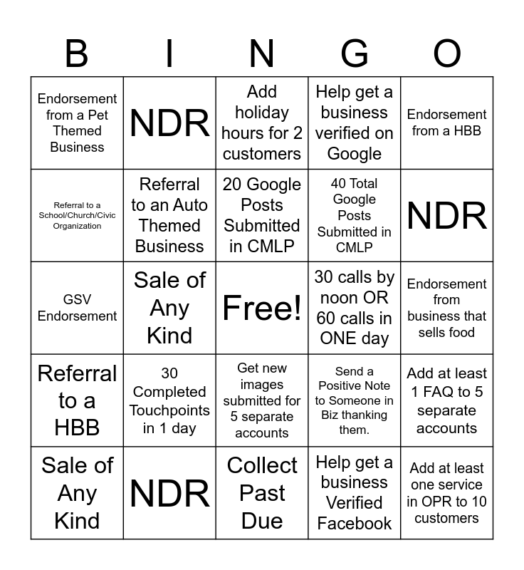 This bingo card has a free space and 24 words: 30 Completed Touchpoints in 1 day, NDR, 20 Google Posts Submitted in CMLP, Sale of Any Kind, Endorsement from a HBB, Endorsement from a Pet Themed Business, Referral to a School/Church/Civic Organization, NDR, 30 calls by noon OR 60 calls in ONE day, Get new images submitted for 5 separate accounts, 40 Total Google Posts Submitted in CMLP, GSV Endorsement, Send a Positive Note to Someone in Biz thanking them., Add at least 1 FAQ to 5 separate accounts, Referral to an Auto Themed Business, Help get a business Verified Facebook, Endorsement from business that sells food, Add holiday hours for 2 customers, NDR, Sale of Any Kind, Add at least one service in OPR to 10 customers, Referral to a HBB, Help get a business verified on Google and Collect Past Due.