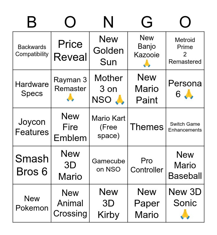 This bingo card has a free space and 24 words: New 3D Mario, New Animal Crossing, Mother 3 on NSO 🙏, New Pokemon, Metroid Prime 2 Remastered, Backwards Compatibility, Hardware Specs, Price Reveal, Themes, Gamecube on NSO, New Mario Paint, Joycon Features, Pro Controller, New Mario Baseball, Rayman 3 Remaster 🙏, New Paper Mario, Switch Game Enhancements, New Golden Sun, Persona 6 🙏, New Fire Emblem, New 3D Sonic 🙏, Smash Bros 6, New Banjo Kazooie 🙏 and New 3D Kirby.